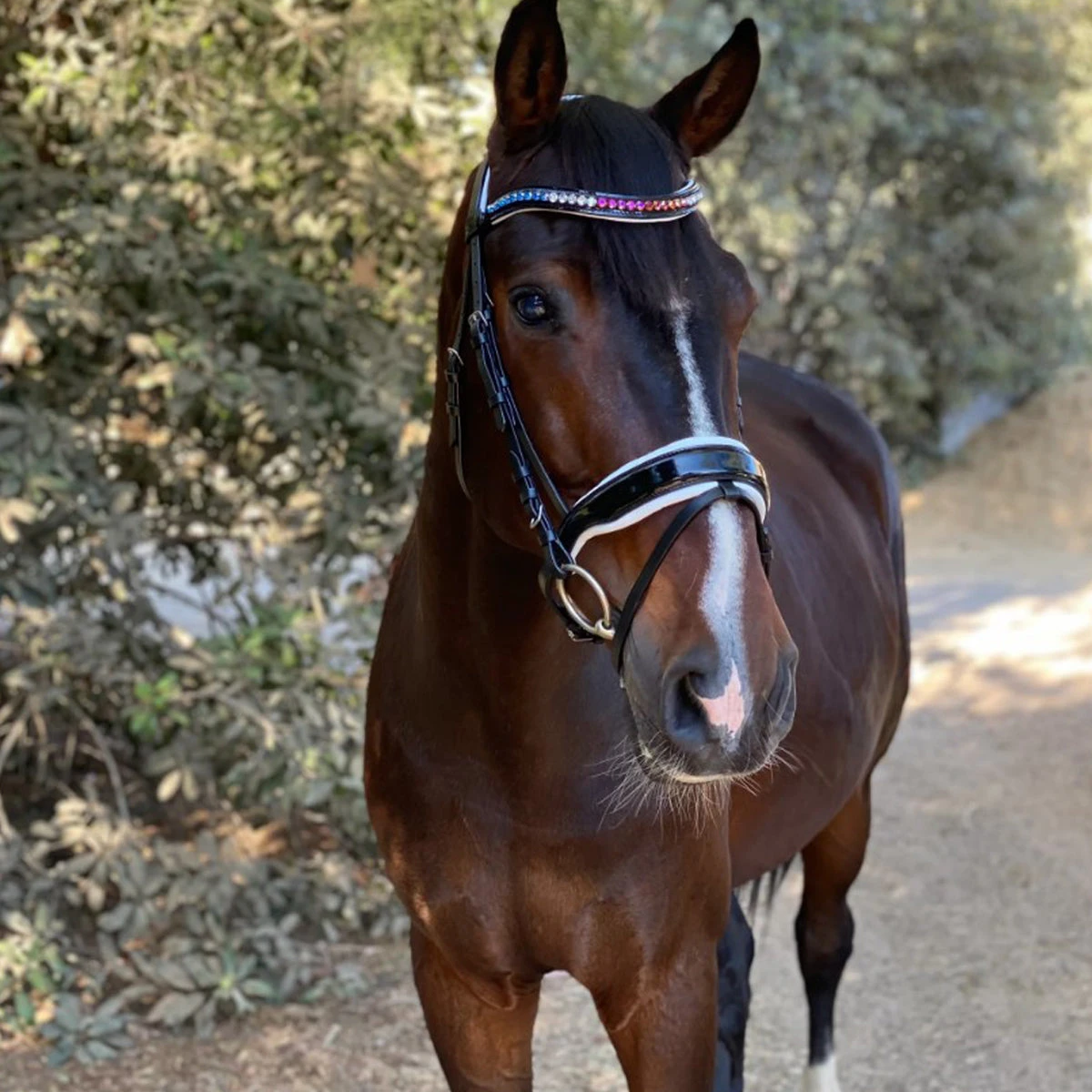 With a monocrown design, patent leather anatomical flash noseband, pillowy soft white padding and matching leather reins with thin rubber lining on the inside and stops. Every feature of this beautiful bridle is designed for comfort and functionality. The patent noseband with black padding is accented by a clear crystal patent leather snap-on browband. This bridle is classic and flattering, with the patent finish making it ideal for competitions. Premium Grade European vegetable tanned Leather, ultra softNappa leather padding for comfort.
